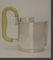 Wilhelm Wagenfeld designed several versions of this very practical table utensil. The first type, from 1923, was Wagenfeld’s project to qualify as a journeyman. It had a rounded form and a glass lid. The third version from 1927/29 had an elegant saucer and ebony handles.