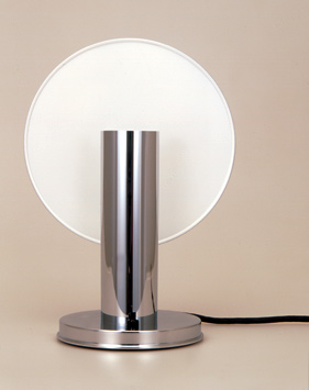 The light source is hidden behind a vertical cylinder, standing on a round base. Behind the cylinder is an asymmetrically mounted, adjustable, white lacquered disc, which spreads a soft light.