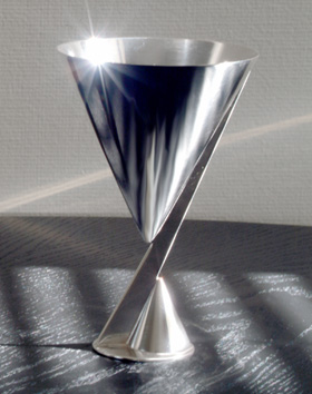These goblets are illustrated in several editions of Art Deco literature. Through the asymetric shift between the upper part of the goblet and the foot, the purely functional form is given a decorative character.