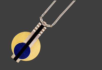 The original design is probably from Gerard Sandoz, 1928. The piece, from which we have reconstructed our pendant differs clearly, both in dimensions and material from the ones shown in the literature. The pendant with the form of a stylized banjo, consists of two semi circular lapis lazulis and one longish onyx. The plate, worked of white and bright gold, is attached to a snake chain.