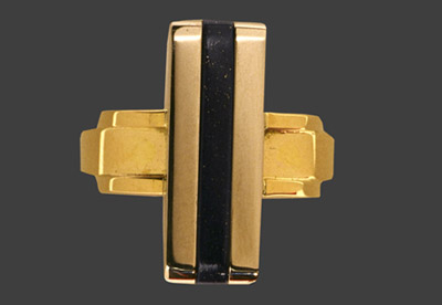 A thin blue precious stone, set in white gold, rests on a heavy bright gold ring. The design, convincing in its clearness and simpleness, came from Denmark, around 1930. We also offer the ring (like the original) – in white gold with an onyx strip.