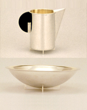 Obviously under the artistic influence of Marianne Brandt, but nevertheless adding his own design, Hans Przyrembel created this cream/sugar set in 1925. The set consists of a creamer and a sugar bowl.
