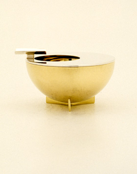In 1924 Marianne Brandt designed a variation on the Bauhaus ashtray. Instead of the strict geometric opening it has a round one with a cigarette holder attached to it, which makes it more practical to use. The removable top is in silver, the base is 18 carat gold plated. The original of this ashtray is part of the collection of the Bauhaus Museum in Dessau.